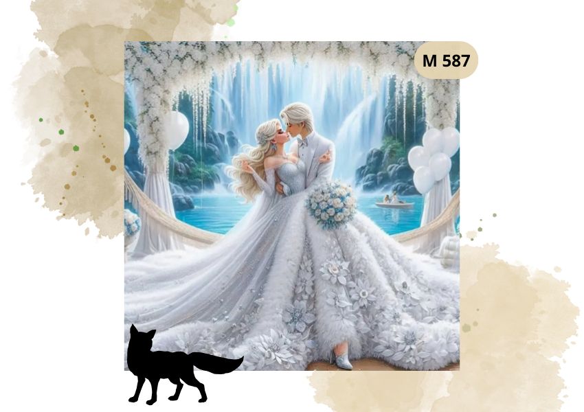 Tło dopełnia atmosferę. Widać tam wodospad, który nadaje obrazowi dynamiki, a jednocześnie spokoju – symbolizuje płynący czas i nowy etap w życiu. Dookoła pary rozsiane są białe ozdoby z kwiatów i balonów, które nadają całości jeszcze bardziej uroczystego charakteru. To właśnie one sprawiają, że scena nabiera wymiaru prawdziwej ceremonii – nie tylko intymnego momentu, ale i święta.
