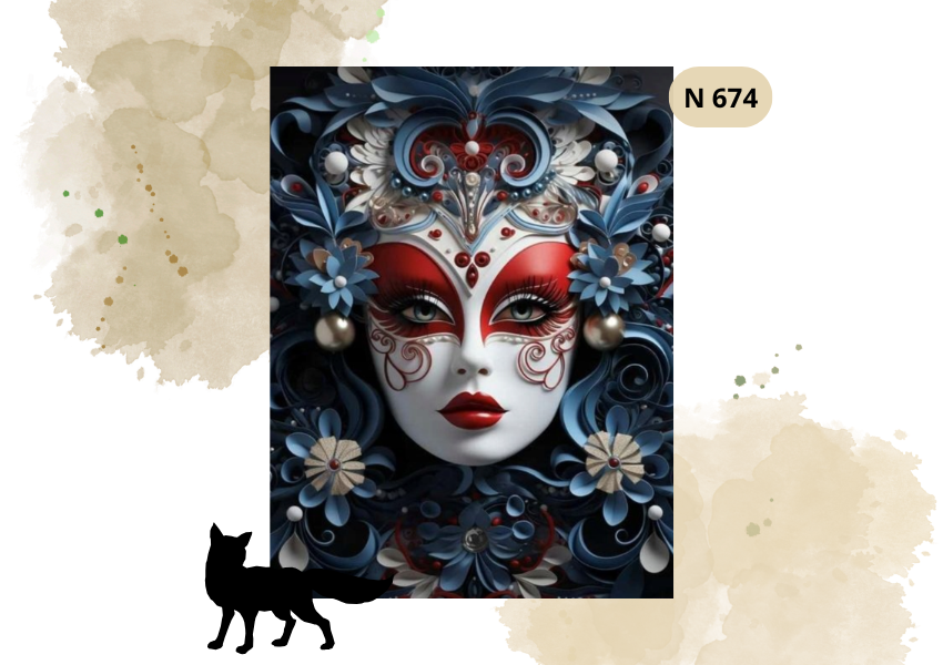 Obraz przedstawia niezwykle efektowną i bogato zdobioną maskę karnawałową, inspirowaną stylem eleganckich balów maskowych, szczególnie kojarzonych z karnawałem w Wenecji. Cała kompozycja jest bardzo dekoracyjna, pełna ornamentów, kwiatowych motywów oraz błyszczących detali, które nadają obrazowi wyjątkowy i luksusowy charakter.
