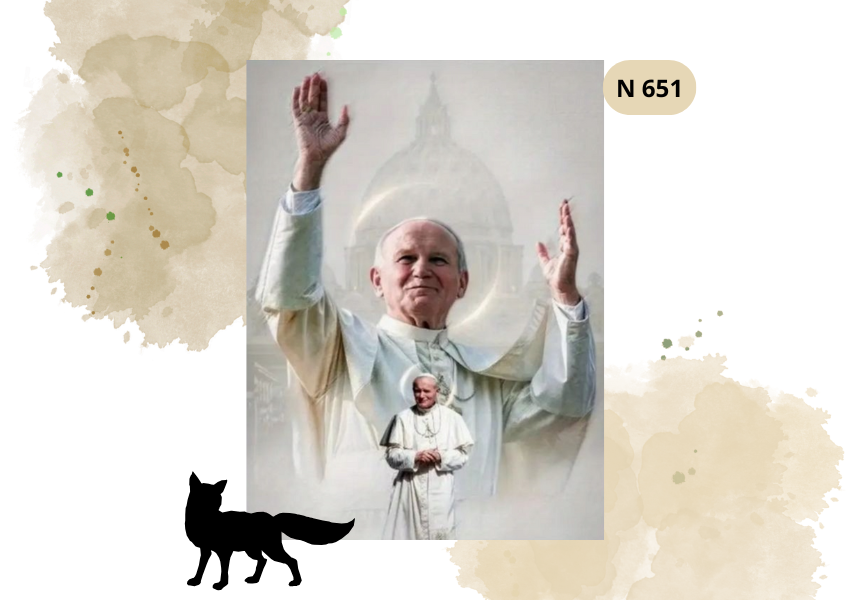 Całość utrzymana jest w jasnej, mleczno–beżowej kolorystyce, bardzo spokojnej, wręcz kojącej. Nie ma tu ostrych kontrastów ani krzykliwych barw. To obraz, który wycisza, skłania do refleksji i przywołuje wspomnienie papieża jako symbolu pokoju, dialogu i miłości do drugiego człowieka. Idealny do domowego kącika modlitwy, salonu czy jako prezent religijny o głębokim znaczeniu.